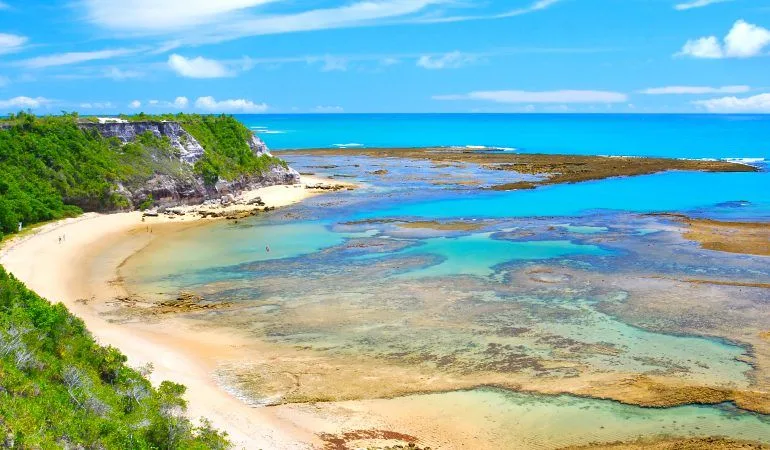 Localizada à beira-mar da Península de Maraú, no litoral sul da Bahia, esta praia é o sonho de qualquer mergulhador. À medida que a maré diminui, ela deixa para trás piscinas de recife azul-turquesa brilhantes, perfeitas para ver uma variedade de peixes tropicais coloridos. Não há necessidade de Photoshop aqui. Essa turquesa é o verdadeiro negócio. A praia em si é larga e dourada por cerca de seis quilômetros, com palmeiras espessas e exuberantes.
