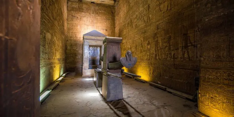 Não perca os detalhes dessa estrutura magnífica, as inscrições gravadas nas paredes, a estátua de hórus localizada na entrada e a barca sagrada que fica dentro do santuário.