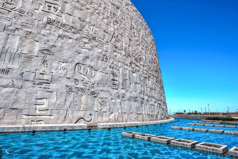 O exterior do edifício é decorado com caracteres de 120 idiomas, como referência à riqueza de conhecimentos de todo o mundo, outrora alojados na Grande Biblioteca, a maior do Egito.