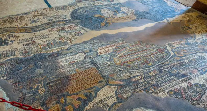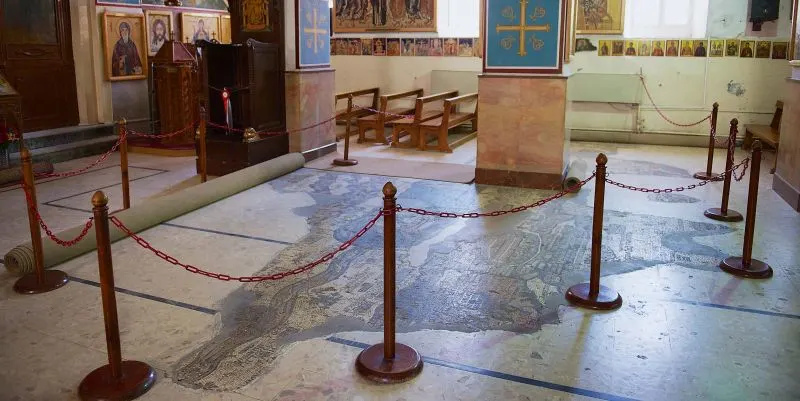 Conheça o Mapa Mosaico de Madaba sob o piso da Igreja Grego Ortodoxa de São Jorge, localizada a noroeste do centro da cidade. A igreja foi construída em 1896 dC, sobre os restos de uma igreja bizantina do século VI. O painel de mosaico que envolvia o Mapa tinha originalmente cerca de 15,6 X 6m, 94 m², mas apenas um quarto do mapa foi conservado.