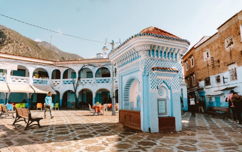 Situada no núcleo urbano encontra-se a Praça Uta El-Hammam, cujo nome homenageia os hammams (banhos turcos) que outrora a circundavam. Este espaço generosamente arborizado funciona como ponto nevrálgico da vida social, reunindo tanto locais quanto visitantes em seus diversos cafés e estabelecimentos gastronômicos, onde o tradicional chá de menta é servido continuamente. Considerada o verdadeiro coração pulsante de Chefchaouen, a praça proporciona ambiente ideal para momentos contemplativos enquanto se observa o fluxo característico da vida local.