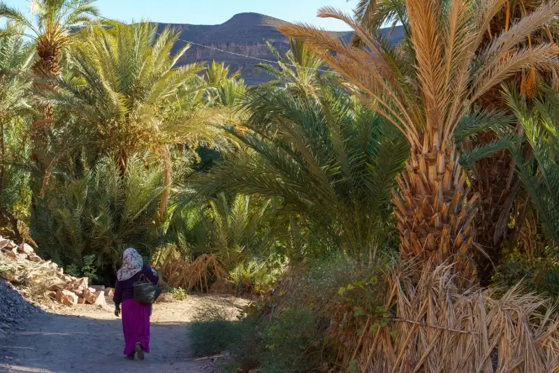 O oásis pulsa com vida através de suas 60 famílias residentes, somando 600 habitantes que mantêm vivas as tradições ancestrais berberes. Suas palmeiras centenárias e árvores frutíferas dançam suavemente com a brisa do deserto, nutridas por um rio cristalino que serpenteia pelo vale durante todas as estações. Este curso d'água precioso sustenta não apenas a agricultura local, mas também cria um espetacular contraste com a vastidão árida que o circunda. Uma estrada de terra batida serve como único portal para este refúgio, preservando assim a autenticidade de um dos mais extraordinários tesouros culturais do Marrocos.