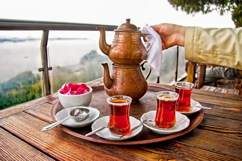 A bebida nacional dos Turcos é o chá-preto, que é feito das folhas de chá-preto cultivadas na região do Mar Negro, e servidas num copo pequeno com açúcar. Os Turcos amam essa bebida de um jeito que eles não passam um dia sem tomar um ou dois copos de chá. Então quando você viajar para lá não deixe de aproveitar.